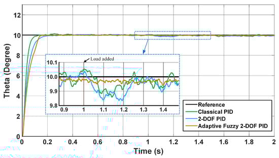 In order to examine the effect of the load on the controller performances in the 2R-UAV Balance System, in the third scenario, the reference balance angle was given as 10 degrees and after the first second, 250 g of load was added to the arm where the BLDCM-1 is located in the system, 15 cm away from the center. In this case, the change of balance angle for all controllers is given in Figure 24. When Figure 24 is examined, all controllers achieved the 10 degree reference balance angle in a short time, as given in the first scenario, and continued to operate stably. When the load was added in the first second, there was a short-term decrease in the balance angle for all controllers and then the reference balance angle was regained. However, it was observed that the AF 2-DOF PID controller proposed in this study achieved the reference balance angle with a much smaller decrease than other controllers.