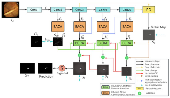 Boundary constraint reverse attention module structure. represents the output of the third, fourth, and fifth layers after passing through the EACA; represents the output of the second layer after passing through the EACA; width and height represent the axial attention [37].