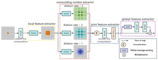 EACA module: Figure 3 shows the architecture of this module. The architecture consists of three parts: (1) An atrous spatial pyramid, which consists of several convolutions: one 3 × 3 normal convolution is used to perform the local feature extractor, which is inside the yellow dashed box, and three 3 × 3 atrous spatial convolutions in the red dashed box, with dilation rates of 1, 2, and 3, are set to increase the perceptual field, acting as the surrounding context extractor. (2) Joint feature extractor: after concatenating the feature maps output from the atrous spatial pyramid, the resultant is passed through batch normalization (BN) and the parametric rectified linear unit (PReLU) to speed up the convergence and alleviate the problem of a potential vanishing gradient in the deep network to a certain extent, corresponding to the blue dashed box. (3) Global feature extractor: the global average pooling is first used as a weighted vector for fine-tuning the joint features channel by channel to emphasize the useful elements and compress the useless ones; then, two layers of fast one-dimensional convolution are used to generate channel attention so that the global context is further extracted based on no dimension reduction; finally, a scale layer is used as the subsequent layer of BN to scale and shift the normalized parameters, re-weight the joint features and correct the features, and retain the valuable features to achieve the purpose of improving the feature expression ability, corresponding to the purple dashed box.
