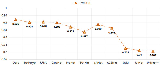 Furthermore, for a more intuitive visualization of the model comparison results, we provide line graphs depicting the mean Dice scores of the ten models across the CVC-300 dataset in Figure 5. Analyzing the reasons, the distinctive feature of CVC-300 is that it presents a smooth and single target.