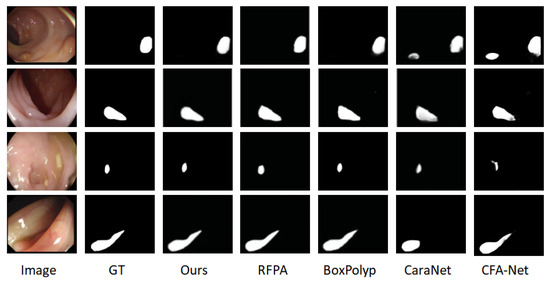 Simultaneously, this study considered eleven comparative models from the realm of intestinal polyp segmentation, namely, U-Net [20], U-Net++ [21], PraNet [25], SANet [43], SFA [24], ACSNet [44], SAM [45], CaraNet [3], RFPA [27], CFA-Net [28], and BoxPolyp [26]. To ensure a fair comparison, we executed open-source code using the same dataset and experimental environment.