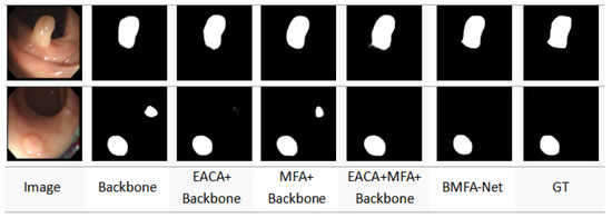 As shown in Figure 8, after removing the EACA module, the segmentation effect was significantly reduced, which indicates that the EACA module was the key module of BMFA-Net and played a positive role in achieving better segmentation performance. Elimination of the BCRA module caused blurred boundaries of the polyp segmentation, suggesting that the boundary constraint ability of the BCRA module made an indispensable contribution to the enhanced segmentation performance. In summary, the design of the BMFA-Net network structure was advanced and effective.