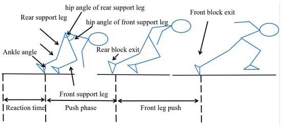This study analyzed the phase from the starting gun fires until the front block exit. To analyze the efficiency of three different biomechanics conditions, three critical events in the starting block phase (reaction time, push phase, and front leg push) were identified, as seen in Figure 2.