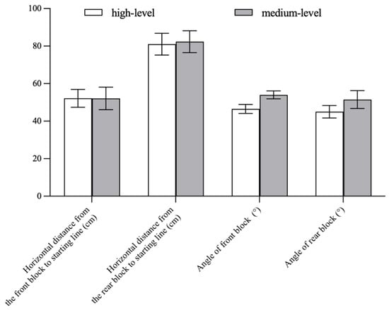 In Figure 3, the average horizontal distance from the front and rear block to the starting line of high-level athletes were not significantly different from that of medium-level athletes (respectively, 52.15 ± 4.78 cm, 81.00 ± 5.77 cm vs. 52.10 ± 5.99 cm, 82.35 ± 5.83 cm, p > 0.05). The average angles of the front and rear blocks of high-level athletes were not significantly different from that of medium-level athletes (respectively, 46.50 ± 2.42°, 45.00 ± 3.33° vs. 54.00 ± 2.11°, 51.50 ± 4.74°, p > 0.05).