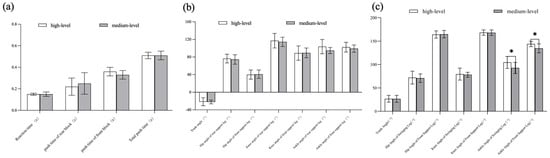All kinetic results are presented in Figure 5 and Table 2. In RFD, the vertical RFD of the rear block of the high-level sprinters was 7.77 ± 3.26 N/s-kg, significantly lower than that of the medium-level sprinters at 13.87 ± 7.08 N/s-kg (p = 0.02, F = 6.12, η2 = 0.25, 90% CI = 0.02, 0.471); the rear block RFD of 15.57 ± 6.09 N/s-kg in high-level sprinters was significantly lower than that of 22.92 ± 8.84 N/s-kg in medium-level sprinters (p = 0.04, F = 4.69, η2 = 0.21, 90% CI = 0.003, 0.43). At maximum starting force, the maximum horizontal force in the front block of high-level 100 m athletes was 1.18 ± 0.09 N/kg, significantly higher than that of medium-level sprinters at 1.03 ± 0.16 N/kg (p = 0.03, F = 4.69, η2 = 0.25, 90% CI = 0.018, 0.465). The maximum vertical force of the rear block of the high-level 100 m athlete was 0.88 ± 0.24 N/kg, significantly lower than the medium-level sprinter’s 1.03 ± 0.16 N/kg (p = 0.05, F = 4.42, η2 = 0.20, 90% CI = 0.00, 0.421).