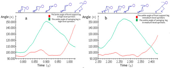 Change in ankle angle of front support leg and swinging leg during the push phase in high-level (a) and medium-level (b) sprinters.