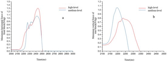 Comparison of the maximum horizontal force of front block (a) and the maximum vertical force of rear block (b) of sprinters at different levels during push phase.