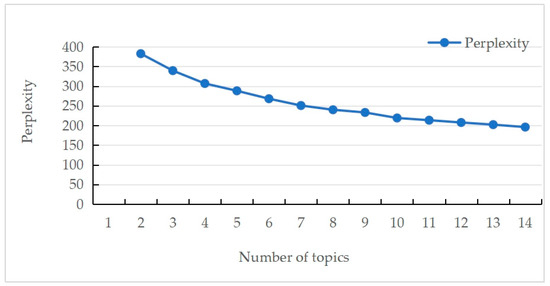 - The LDA–Gibbs text theme model was employed to calculate the distribution of high-frequency feature words in the dataset, facilitating its structured processing. Subsequently, the perplexity of the overall text was computed to determine the optimal number of themes. A second round of LDA–Gibbs model computation was performed based on the determined optimal theme number, resulting in the final theme text model.