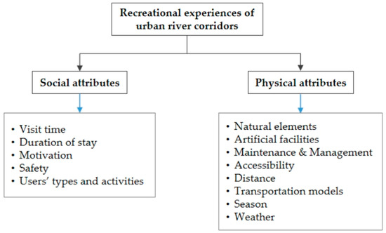 | 5 | Characteristics of urban river corridor | Natural landscape (vegetation, animals, water), artificial facilities (fitness trails, sports facilities, fountain, outdoor terraces, pavilion, sculpture, etc.) |