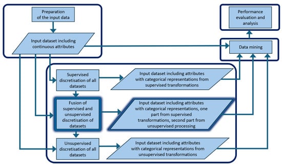 After this initial part, the processing of the data follows. It encompasses the application of discretisation procedures by selected algorithms, which results in receiving several discrete variants of the input data. The fusion of information from the supervised and unsupervised discretisation approaches constitutes the central part of the research procedure, and it is highlighted in the diagram.