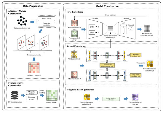 - Dynamic weighted network generation by multi-level embedding. Each adjacency and feature matrix is input into VGAE for the first embedding. After learning the low-dimensional representations of the nodes, a node attribute matrix collection is generated to represent the node attribute information in each protein subnetwork. Then, each attribute and adjacency matrix are input into DNAE for the second embedding, generating multiple low-dimensional embeddings . These embeddings are concatenated in series to construct a weighted PPIN by cosine similarity.