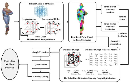 The pipeline of the proposed texture-guided graph transform optimization framework for point cloud attribute compression is depicted in Figure 1. Before the attribute compression, the geometry information is already coded and available as side information for point cloud attribute compression. Then, at the beginning of the attribute compression framework, the geometry information is organized based on the Hilbert curve in 3D space to preserve attribute spatial correlation. Subsequently, the reordered point cloud is divided into local clusters with uniform point counts, ensuring balanced graph sizes for subsequent processing. Intra-cluster attribute analysis is then conducted to extract texture complexity priors from local regions, which guide the optimization of the graph. Inter-cluster attribute prediction further reduces spatial redundancy by leveraging attributes from previously decoded clusters. During the graph optimization process, point attribute residuals are treated as graph signals, and the graph topology and adjacency matrix are determined by our optimization-based graph construction scheme. This scheme considers transform decorrelation, graph sparsity, distortion, and bitrate terms to optimize the graph transform for each cluster, integrating both geometry structure and texture priors. Compressed attribute residuals are obtained using the optimized graph transform, resulting in transformed point cloud attribute coefficients. Finally, these coefficients are quantized, entropy coded, and assembled into the total bitstream, thereby completing the compression process.
