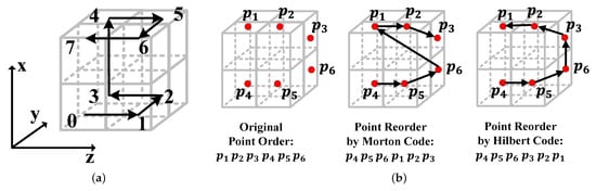 The proposed Hilbert-based point reorder operation. (a) An example of the fitted Hilbert filling curve in a 3D cube. The numbers from 0 to 7 represent the Hilbert-based order of points in the 3D cube. (b) An example of original points reordered by the traditional Morton code and our Hilbert code.