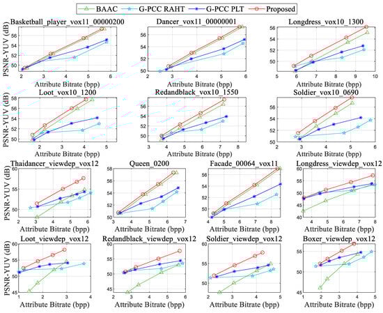 When compared with the graph transform anchor BAAC, our scheme achieves average BD-BR gains of 16.24%, 19.59%, and 20.44% on coding Y, U, and V components, respectively. The results denote that when equivalent reconstruction quality is achieved, our scheme can realize bitrate savings of 16.24%, 19.59%, and 20.44% on coding Y, U, and V components in comparison to BAAC. These bitrate savings are indeed crucial, as they directly translate into reduced point cloud storage requirements and transmission bandwidth. This performance enhancement over BAAC is achieved by leveraging texture-guided priors in the joint rate–distortion–sparsity optimization process for graph construction. Unlike BAAC, which solely relies on geometry information for graph construction, our scheme transcends such limitations, resulting in superior coding performance improvement. The consistent and substantial attribute BD-BR gains obtained by our scheme across all tests underscore its effectiveness and robustness in compressing point clouds with diverse attribute features. These findings consistently validate the superior coding efficiency of our approach for point cloud attribute compression.
