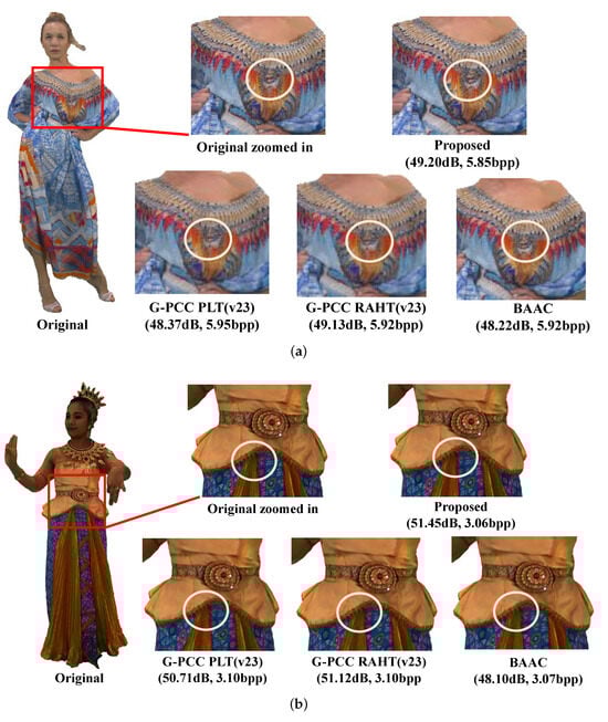 Since the experimental tests are conducted at different bitrate points for point cloud attribute lossy compression, presenting compression ratios alone in Table 3 may not adequately reflect the degree of attribute coding distortion. As shown in Figure 4, we provide the results of the total attribute bitrates and combined PSNR values at each testing bitrate point of the proposed scheme and comparative platforms. In the R-D curves of Figure 4, the x-axis represents the total attribute bitrates, while the y-axis represents the combined PSNR values at each testing bitrate point. In Figure 4, consistent R-D performance gains are evident with the proposed scheme across the majority of datasets at various bitrate points. While BAAC achieves comparable coding performance with a slight BD-BR loss compared to our scheme on MPEG solid point cloud datasets, the performance gap widens significantly when compressing MPEG dense point clouds. This discrepancy stems from the increased geometry precision of dense point clouds, leading to a more intricate distribution of textures in geometry space. BAAC, relying solely on geometry information for graph construction, fails to adequately capture attribute correlations. Consequently, the decorrelation capability of the generated graph transform for point cloud attribute compression is diminished. These results highlight our scheme’s versatility in handling different types of point clouds and its ability to achieve substantial coding performance improvements over state-of-the-art methods at various bitrate points.