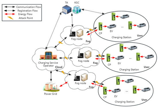 The vehicle-to-grid (V2G) network enables bidirectional communication and power exchange between electric vehicles (EVs) and the power grid [1]. EVs can serve as distributed energy storage systems [2], charging from the grid during low demand periods and discharging during peak demand, thus helping to alleviate grid load fluctuations and providing economic benefits to EV users [3]. With policy support and ongoing battery technology innovation, the EV industry is experiencing rapid development [4]. The International Energy Agency (IEA) estimates that the global number of EVs will reach 230 million by 2030 [5]. In the V2G network scenario, the charging pile (CP) uploads the charging and discharging data of EVs to the charging service operator (CSO) for processing, and then the CSO issues control commands to the CP to manage the EV. The data in the V2G network contain a large amount of private information, including the EV user’s identity, license plate number, physical card number, charging pile number, charging and discharging quantity, and geographic location [6].