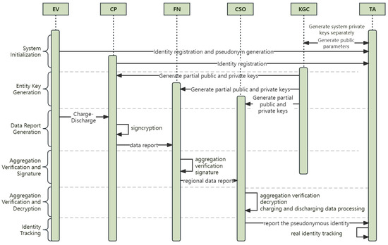 In order to address the privacy protection issues of charging and discharging data in V2G networks, data-based privacy protection schemes were proposed in [13,14,15], mainly encrypting the data to make them difficult for attackers to obtain. However, these schemes involve complex operations and high computational overhead, which are not suitable for V2G network environments with limited resources. Identity-based privacy protection schemes were proposed in [16,17,18,19] that mainly protect the users’ privacy by blurring the true identity of EV users. In [20], fog computing was combined with blockchain technology to achieve the security of the EV charging process. Xia et al. [21] proposed a charging identity authentication scheme based on fog computing that uses group signatures to protect the privacy of EV users. However, this scheme has issues with certificate management and key escrow. Moreover, the above schemes protect the identity of EV users, but charging and discharging data in V2G networks may still be eavesdropped on, so the EV users’ identity and charging and discharging data must be protected at the same time.
