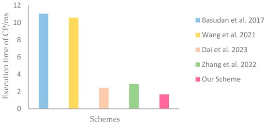 The security features of the relevant representative schemes (i.e., Wang et al. [13], Zhang et al. [25], Basudan et al. [27], and Dohare et al. [29]) are compared as shown in Table 2, proving that our scheme’s security surpasses those of the others. The symbol √ indicates compliance with the security feature, while × indicates non-compliance.
