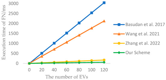 Figure 3 shows the computation costs of CP signcryption among the relevant CLASC schemes. The computation cost of FN verification compared with other schemes is shown in Figure 4. We can see that neither [24,25] nor our scheme involves bilinear mapping operations, resulting in higher execution efficiency compared to [27,28]. With the increase in the number of charging and discharging EVs, the computation overhead of the FN becomes lower and lower compared with other schemes. When , charging and discharging data reports are uploaded in the local area, and the total aggregation verification time of the FN is 57.837 ms, which is a very effective and reasonable time assumption for FNs with certain computing abilities.