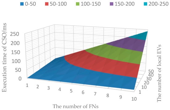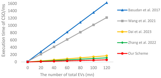 Figure 5 shows the computation cost of the CSO in this scheme with the increase in the number of FNs and the number of EVs in the local region . Assuming that the number of FNs , the comparison of computation costs of the CSO is shown in Figure 6. It can be seen that the advantages of our scheme are gradually reflected in the increase in the number of FNs and the number of EVs in the local region. In summary, the CLASC scheme designed in this paper has lower computational overhead compared to several other schemes, resulting in higher execution efficiency.