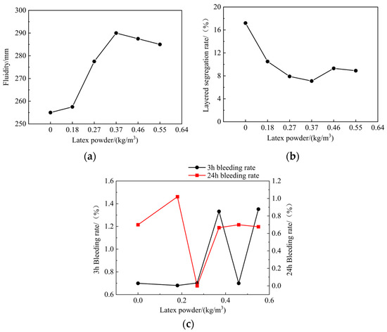 As shown in Figure 2a, with the increase in latex powder content, the fluidity of the slurry first increases and then decreases. This is because the water-soluble protective colloidal coating of redispersible latex powder particles can prevent aggregation between particles, and latex powder has air entrainment properties, which can introduce a large number of tiny bubbles, allowing polymer particles and tiny bubbles to produce a “ball-bearing effect” in the cement slurry [42,43]. Therefore, the addition of latex powder increases the fluidity of the slurry [44,45]. However, as the latex powder content further increases, the fluidity of the slurry decreases. This is because the dissolved latex powder becomes more viscous, increasing the viscosity of the mortar [46] and the internal friction of the slurry [47], resulting in a decrease in slurry fluidity. As shown in Figure 2b, with the increase in latex powder content, the segregation rate of the slurry generally shows a downward trend. This is because the incorporation of latex powder can increase the water retention of the slurry [48], enhance the hydration within the slurry, as well as cohesion and adhesion [49,50], thereby improving mortar stability [40] and reducing the segregation rate. However, when the content exceeds 0.37 kg/m3, the segregation rate increases slightly. This is because when the latex powder content is too high, it can adhere to the surface of cement particles, impeding the contact between cement and water and weakening the hydration reaction [51], which in turn increases the slurry segregation rate.