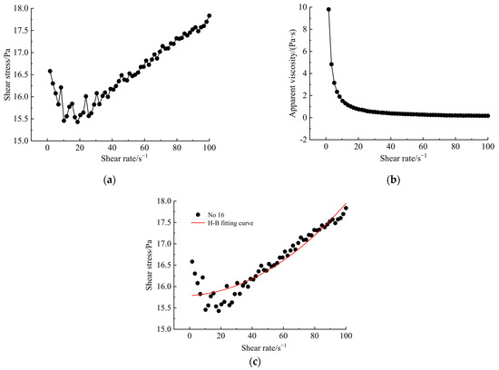 Because the rheological curve trends of each test group were roughly the same and the slurry in group 16 had better anti-segregation and anti-bleeding properties, the rheological curve of the group 16 slurry was selected for analysis. The shear stress τ, shear rate γ, and apparent viscosity η–shear rate γ characteristic curves of the rheological test of the group 16 samples are shown in Figure 3a,b. The rheology of synchronous grouting slurry can reflect its flow and deformation patterns under different shear rates and express the corresponding relationship between the shear stress and rate [52]. Therefore, the rheological parameters—yield shear stress τ0 and viscosity coefficient K—can quantitatively describe the flow state of the synchronous grouting slurry. When the shear rate was lower than 10 s−1, the shear stress decreased, and the apparent viscosity decreased rapidly as the shear rate increased. When the shear rate reached 10 s−1, the shear stress of the grouting slurry increased linearly with increasing shear rate, and the viscosity was stable.