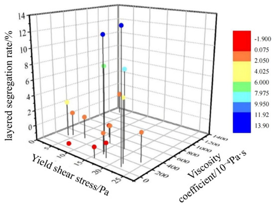 Considering the segregation rate to explore the influence of rheology on the segregation phenomenon, a three-dimensional scatter plot of the yield shear stress, viscosity coefficient, and segregation rate was generated.
