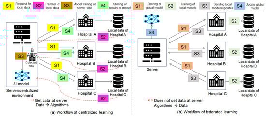 Federated learning (FL) is a promising paradigm that assists distributed clients to jointly train/learn a shared AI model (machine learning (ML) or deep learning (DL)) without disclosing personal data [1]. For example, multiple hospitals or research institutes can collaboratively train an AI model to enhance predictive accuracy for a particular problem/task without sharing the data on which the model is trained. FL has revolutionized the privacy-preserving domain with this unique concept (i.e., no acquisition of personal data). Specifically, FL focuses on bringing algorithms close to the data, rather than bringing the data to the algorithms. Before the advent of FL, the centralized learning (CL) domain always gathered personal data at a central server first, and machine learning algorithms were trained subsequently. However, the key problems in CL are more privacy breaches, a lack of guidance on managing privacy settings, and market monopolization by the tech giants. The concrete difference between FL and CL is provided in Figure 1. As shown in Figure 1, FL is a decentralized approach, meaning algorithms are brought close to the data, not data brought to the algorithms. It empowers users to preserve privacy effectively by not sharing any kind of data with a central server [2]. The application areas of FL are continuously expanding into many sectors, including energy management, supply chains, smart healthcare, biomedical apps, finance, and motion control.