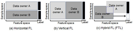 Referring to Figure 2, there are six different types of classifications of FL systems. The data-based classification of FL has three main types [13]. In the horizontal FL (HFL), the sample space is different but the feature space is the same. In contrast, vertical FL (VFL) has the same sample space but feature space is different [2]. In hybrid FL (also known as federated transfer learning (FTL)), both feature and sample spaces are different [14]. An example of all three classifications of FL (e.g., HFL, VFL, and hybrid/FTL) is given in Figure 3.