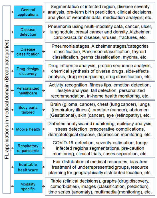 Recently, many promising applications of FL have been identified in the medical domain by utilizing data from diverse modalities (e.g., images, time series, signals, etc.) [24]. Furthermore, the recent FL developments have led to higher collaboration between the institutes that share common interests, and therefore the application stack of FL is swiftly expanding. Through detailed analysis of high-quality literature, we identified and organized the FL application in the medical domain into ten different categories as shown in Figure 5. To the best of the authors’ knowledge, none of the previous studies has grouped FL applications into such broad categories. The analysis given in Figure 5 can help understand the FL applications in the medical domain from a broader perspective. We believe the future applications of FL in the medical domain can likely fall into one of these categories.