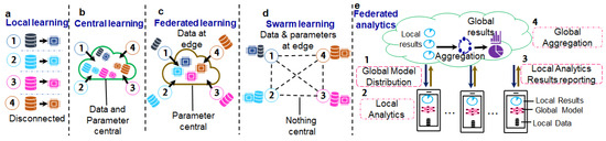See Figure 8c. Later, FL evolved into swarm learning (SL) in which there is no need for a central server because both data and parameters stay at the edge, as seen in Figure 8d. SL is one of the technologies resulting from FL.