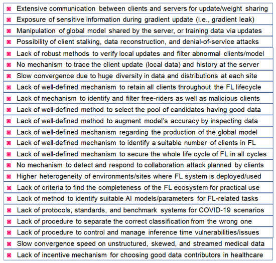 Since FL’s inception, a substantial number of technical deficiencies in the FL ecosystem have been observed from multiple perspectives, and many developments are underway to enhance the persuasiveness of the FL ecosystem. For example, in the FL ecosystem, attackers can compromise clients’ data or updates, corrupt the server-side global model, infer/reconstruct training data, slow the convergence speed, degrade the accuracy of global/local models, and/or predict sensitive information about clients [62]. In COVID-19 scenarios, the FL ecosystem can be trapped into slow convergence as well as lower prediction differences due to greater differences in data distributions/imbalances at each site [63]. Furthermore, deployment of the FL ecosystem for COVID-19 classification/prediction tasks can be subjected to adversarial attacks and data breaches. Hence, securing the FL ecosystem from a variety of adversarial attacks is an important concern in FL ecosystems [23]. In Figure 9, we present a detailed overview of the technical factors in the FL ecosystem that are the foundation of many adversarial attacks on these systems. The detailed analysis in Figure 9 can pave the way to improving the FL ecosystem from a technical perspective. In future endeavors, efficient solutions for all the challenges in Figure 9 are imperative in order to truly benefit from the potential of FL. Apart from the challenges in Figure 9, below, we pinpointed eight main future research aspects that need urgent solutions in the context of general FL and general medical domain including COVID-19.