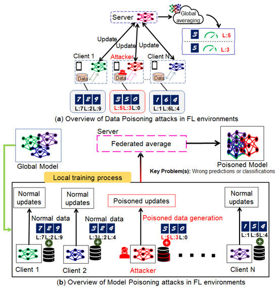- Practical methods for enhancing security and privacy in FL ecosystems: FL ecosystems are constantly targeted by active/passive attackers to impair model performance [66,67]. Attacks that corrupt/damage global model performance by manipulating either model updates or samples of training data are referred to as poisoning attacks (PAs) [68]. PAs can be classified into two types: