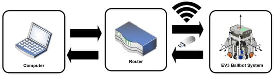 The Simulink® support package for LEGO Mindstorms EV3 hardware is easy to use since each block works like any other Simulink® block. When the code is completed, Simulink® translates it into the C++ code and transfers it to the LEGO Mindstorms EV3 brick via Bluetooth, WiFi, USB, or ethernet connection. One of the main difficulties in achieving the connection between the brick and Simulink® is to find the appropriate firmware version for the LEGO EV3 block that is compatible with the version of MATLAB® being used. In this work, the connection between the brick and the host computer running MATLAB® 2018a/Simulink® is established by way of WiFi access via the brick’s USB port, for an execution time of 20 s and a sampling time of 0.01 s. Figure 6 shows the hardware connections used to carry out the experimental evaluation.