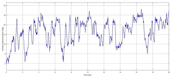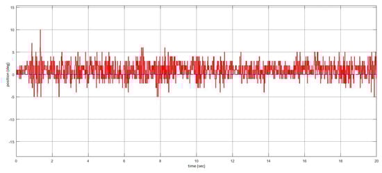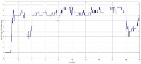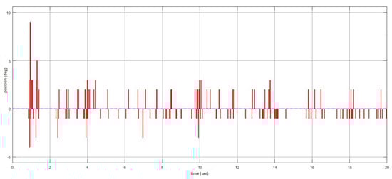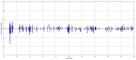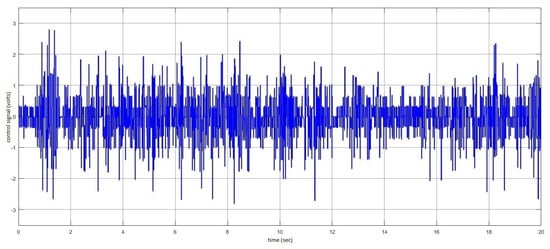 The following results were obtained from a real-time testing prototype using an EV3 brick, including the LEGO Mindstorms kit, an ASUS TUF Gaming A15 Laptop (ASUS, Taipei, China), a tp-link wireless router WR840N (TP-Link, Shenzhen, China), and a NETGEAR N150 Wireless USB adapter WNA1100 (Netgear, Inc., San Jose, CA, USA). So, the measurement and control data to and from the EV3BRS are transferred via telecontrol and telemetry. The EV3BRS prototype is shown in Figure 8. Figure 9, Figure 10, Figure 11, Figure 12, Figure 13 and Figure 14 exhibit the real-time performance in the closed loop of the TSFC for the initial condition of zero, i.e., in the case for which the EV3BRS’s body is released from the upright position. From Figure 9 and Figure 10, it can be seen that the EV3BRS’s body is maintained around zero, i.e., near the upright position, showing a better balance on the plane of motion in contrast with that from the plane of motion . Figure 11 and Figure 12 show the dynamics for each rotor shaft of the actuators. The control signal for each actuator is shown in Figure 13 and Figure 14, from which it can be seen that the actuator aligned with the x-axis demands a minor effort in comparison with that aligned with the y-axis. It must be noticed that in this work, the control task consists of maintaining the EV3BRS’s body at its upright position and neglecting the translational displacement of the EV3BRS on the plane of motion . So, from experimental results, it can be noticed that the control objective is successfully achieved. A video is attached to this draft version of the manuscript in the (Supplementary Materials).