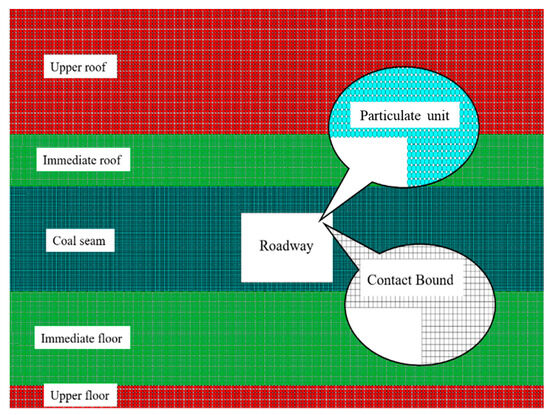 This study is focused on a belt conveyance haulage way in the working face of the Chahasu mine in Erdos, China, with a burial depth of approximately 650 m and a coal seam depth of 6.0 m. The immediate roof and floor were made up of mudstone with depths of 3.2 and 5.4 m, respectively, while the upper roof and floor were made up of medium-grained sandstone. The rectangular roadway cross-section was 5.8 m in width and 4.0 m in height. The surrounding rocks’ deformation and failure process after the roadway’s excavation was simulated using the PFC2D (particle flow code in two dimensions) software produced by Itasca Consulting Group, Inc. (Minneapolis, MN, USA), via the established discrete element model shown in Figure 1. The model dimensions were 36.0 m × 24.0 m. In the numerical simulation, the radii of particles in the coal seam, immediate roof/floor, and upper roof/floor were set at 0.05, 0.1, and 0.2 m, respectively.