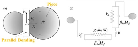 A parallel bonding model is used between particles, and bonding bonds are set between adjacent particles. The parallel bonding model is one of the bonding models built into the software, the core implementation of which is to generate a bonding material of a certain size between neighboring particles. When the bonding material is broken, the broken surface of the particles will become a linear stiffness model. In this model, the particles can be similar to springs with constant normal and tangential stiffness, uniformly distributed in a rectangular cross-section on the contact plane centered at the point of contact. These springs act in parallel with the springs of the linear assembly to produce a parallel bond, and then contact occurs where the bond breaks if the maximum stress exceeds the bond strength. It is possible to model the contact forces and moments expressed as follows: