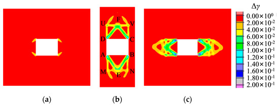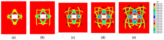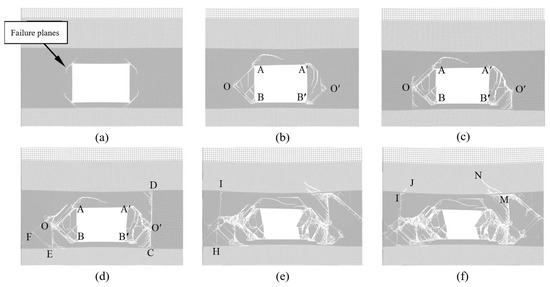 Figure 16 shows the development of the fractured zones at identical vertical and horizontal stresses of 25.0 MPa. The first layer of the fracture loop was first formed in the surrounding rocks (see Figure 16a), which then developed to form the second layer of the fracture loop (see Figure 16b,c). After forming the AEBFCGDH fracture loop (see Figure 16c), the fracture planes developed from the AE, EB, BF, FC, CG, GD, DH, and DA boundaries toward the deep surrounding rocks via the compression–shear conjugate failure pattern (see Figure 16d). Finally, the AI, IE, EJ, JB, BK, KF, FL, LC, CM, MG, GN, ND, DO, OH, HP, and PA fracture planes were formed in the third layer of the fracture loop. The fractures outside the third layer of the fracture loop continued their outward development along LCM, NGM, and NDO boundaries in a conjugate failure pattern.