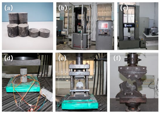 Testing of mechanical parameters of surrounding rock: (a) test specimen; (b) servo testing machine; (c) shear tester; (d) uniaxial compressive test; (e) tensile test; and (f) shear test.