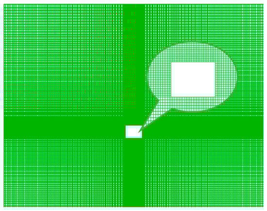 The deformation and fracture processes after roadway excavation were numerically simulated in this study by a model with a size of 80.0 m × 64.0 m, as shown in Figure 5, which was realized via the commercial FLAC2D software package. The roadway vicinity was represented by a refined mesh with a size of 0.2 m × 0.2 m.