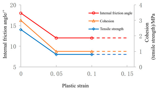 In the simulations, we used a strain softening model for the reduction. The rock density was set at 2300 kg/m3, while the bulk and shear moduli were set at 1.2 and 0.3 GPa, respectively. The strain softening model is a commonly used simulation method based on the Moore–Coulomb model that is not associated with the shear flow law but with the tensile flow law, the difference being that the cohesion, friction angle, shear expansion and dilatation, and tensile strength may change after the onset of plastic yielding. In the Moore–Coulomb model, such properties are assumed to remain constant. Users can define their own softening parameters, such as cohesion and friction angle, and set them as segmented linear functions (Figure 6). They can then use these softening parameters to measure plastic shear strains. In this model, we use data obtained from physical tests. This model calculates the total plastic shear and tensile strains by increasing the softening parameter at each time step and, in this way, drives the material properties to be consistent with the user-defined functions. For yield and potential functions, the plastic flow law and stress corrections are identical to the Moore–Coulomb model.