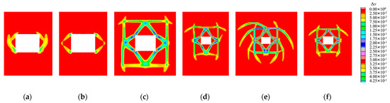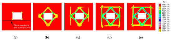 Figure 14 shows the distribution pattern of the significantly fractured zones in the roadway-surrounding rocks for the strength parameters in schemes 1–6. As seen in Figure 14, the increased rock strength parameters hindered the development of the disintegration zones and vice versa. After the internal friction angle was doubled, significant fractured zones developed only on both sides (see Figure 14a), and the maximum shear strain increment of 0.06 appeared at two footings, reaching about 29% of the value in the original scheme (see Figure 7e). After the cohesive force was doubled, significantly fractured zones also developed on two sides (Figure 14b). The maximum shear strain increment appeared on two shoulders and footings and approximately equaled 0.105, which was 50% of the original scheme’s value. After the tensile strength was doubled, the distribution pattern and range of the fractured zones (see Figure 14c) were similar to those in the original scheme, while the maximum shear strain increment remained unchanged (0.21). Therefore, the effect of tensile strength on the development of fractured zones was weaker than that of the internal friction angle and cohesive force.