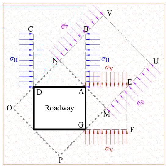 According to numerical simulation results, the development of the fracture planes of the surrounding rocks in the roadway followed the compression–shear conjugate fracture patterns of rock mechanics [18]. In the rectangular roadway after excavation, as shown in Figure 8, the shallow surrounding rocks became loose toward the roadway, and the stresses perpendicular to the roadway surface were gradually released. Accordingly, the shallow surrounding rocks underwent bidirectional compression. Therefore, the stress condition of the roadway could be reduced to a plane strain state. The stress conditions on the roof and the floor are shown in Figure 8 by ABCD, while AEFG corresponds to the stress conditions on both sides. When the horizontal σH and vertical σV stresses in the surrounding rocks exceeded the compressive strength value, conjugate failure occurred along the AM, GM, AN, and DN lines. After the conjugate fracture planes intersected, they formed an enclosed fracture loop MNOP in the surrounding rocks. The shallow surrounding rocks in the roadway were fractured and cut into wedge-shaped blocks by the fracture loop MNOP, as shown by the triangle AMG in Figure 8. Under high-stress conditions, the surrounding rocks could easily slip toward the roadway. After this loosening, the MNOP acted as a new roadway boundary: the stressed body under plane strain conditions (such as MUVN) continued to be isolated along each side of the MNOP. When the pressure σs exceeded the strength of the surrounding rocks, the conjugate shear fracture occurred, and a new fracture loop was formed outside the MNOP.