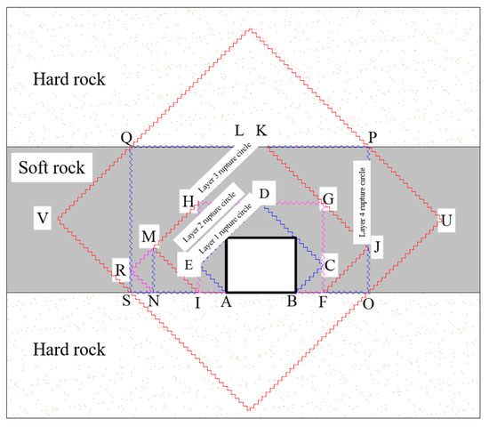 The expansion process of a fractured zone in the roadway with a strong-soft-strong composite surrounding rock. Capital letters A,B,C,D,E,F,G,H,I,J,K,L,M,N,O,P,Q,R,S,U,V denote geometric intersections.