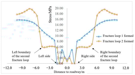 A comprehensive analysis of the simulation results presented in Figure 4 and the above fracture patterns revealed that the first and fourth layers of the fracture loops developed only in soft strata without penetrating the hard strata. With the expanding boundary of the loosening loop, the vertical pressures acting on the roof and floor gradually dropped. For example, during the process shown in Figure 6, the vertical stress variation along the preset stress-monitoring line (Figure 7a) set up in the roadway floor occurred, as shown in Figure 10. After forming the second layer of the fracture loop, the mean vertical stress on the floor between the left and right boundaries dropped by approximately 40% compared with the value reached after the formation of the first layer of the fracture loop. After forming the first layer of the fracture loop, as shown in Figure 8, the stress on the floor within the range AB was close to zero, while both sides AI and BF were located in the stress-reduction zone. After forming the second layer of the fracture loop, the stresses within the AI and BF ranges further decreased. Accompanied by the decline in vertical pressure, the floor became prone to compression–shear failure. It was assumed that the roof and the floor reached their ultimate condition when the loosening fractured zones developed into OPQS. Afterward, the fractures developed towards the deep roof, the floor, and both sides in a compression–shear conjugate failure pattern.