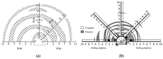 Wang et al. constructed the characteristic lines of the roadway perimeter based on the elastoplastic flow theory and pointed out that the zonal disintegration can be obtained by reproducing the cave shape using a family of characteristic lines [24], as shown in Figure 11. Based on the actual measurement results of Meng [25], Shemyakin et al. reported that the zonal disintegration occurred in a circular damage zone, with a certain distance (spacing) between damaged zones and a circular intact zone between adjacent damaged zones. Moreover, the neighboring disintegration regions were separated by annular intact ones, while slip or failure lines intersected to a certain degree, which was not consistent with the actual condition of zonal disintegration. According to field measurements, not all disintegration zones were annular or completely separated from each other. Figure 12a shows the measured results in [25], where different numbers of disintegration zones can be observed in the drilling holes 2, 3, 4, and 5, suggesting fairly complex spatial relationships between fractured zones. The data in [5] can also validate the measured results (see Figure 12b).