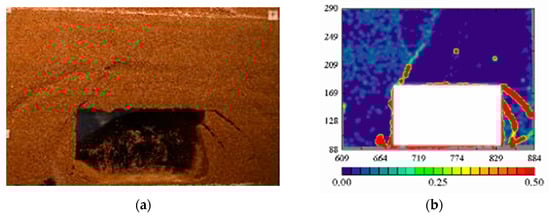 Figure 13 shows the failure mode of the surrounding rocks in the roadway obtained via physical analog modeling in the study [26]. Specifically, Figure 13a is the physical image, while Figure 13b is a digital photograph depicting shear deformation in the surrounding rocks. The conjugate failure in the physical analog test and the fracture planes in the numerical simulation results reflect similar development processes, confirming the rationality of interpreting zonal disintegration via the compression–shear conjugate failure pattern.