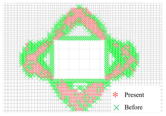 According to the discrete element analysis predictions, the fracturing of the surrounding rocks in the roadway first occurred at four angular points (see Figure 7a) and developed in the form of compression–shear conjugate damage deep into the two sides, the roof, and the floor, until the fractures became intersected (see Figure 7b), thereby forming a tilted rectangular fracture loop. After the conjugate fracture planes intersected, the fractures developed from the intersection point toward the deep surrounding rocks along vertical and horizontal directions (see Figure 7c) until they intersected (see Figure 7d). Accordingly, a new rectangular fracture loop was formed outside the first layer of the fracture loop. Next, the fracture planes developed from the four angular points of the second layer of rectangular fracture loop deep towards the sides, the roof, and the floor in a shear fracture mode (see Figure 7e).