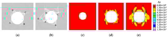 Fracture form in a circular roadway-surrounding rock. (a,b) denote the simulation of the fracture of the surrounding rock of the roadway in the PFC model, respectively. (c–e) denote the fracture of the roadway surrounding rock at each stage in the FLAC model, respectively.