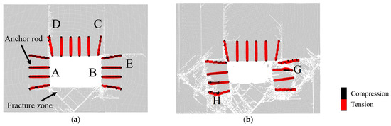 After the reinforcement of the roof and two sides by the anchor rods, the initial failure of the surrounding rocks occurred on the floor. The conjugate failure plane was formed and extended from two shoulders of the roadway in the vertical or horizontal directions, as illustrated by the AD, BC, and BE fracture planes in Figure 19a. As the stress in the roof increased, the compression–shear failure began to appear on two sides and developed deeper toward the surrounding rocks in a conjugate-failure pattern (see Figure 19b). By monitoring the forces acting on the anchor rods, it can be concluded that the anchor rods were mainly subjected to tension. This occurred because the radial displacement of the shallow surrounding rocks was larger than that of the deep rocks when the surrounding rocks at different depths underwent deformation and movement toward the roadway, thus putting each anchor rod as a whole in a tensile state. When the surrounding rocks were fractured, the integrated rocks moved along the shear-fractured zones, and the anchor rods were subjected to bending moments. In the bending deformation of the anchor rods, the bulk of the bent segment was under compression, as shown by stress conditions near points H and G in Figure 19b. Therefore, the compression of the anchor rods in the roadway-surrounding rocks in the zonal disintegration state could be measured via strain gauges attached to the anchor rod surface.